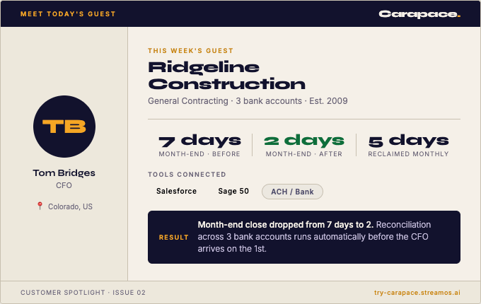 Carapace connected Salesforce, Sage 50, and the bank feeds and automated the entire month-end close process.