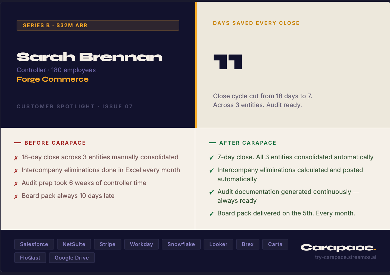 We had three entities and an 18-day close. Carapace automated the intercompany eliminations, made our audit documentation continuous, and got us to a 7-day close. Our auditors asked what changed. I told them everything.